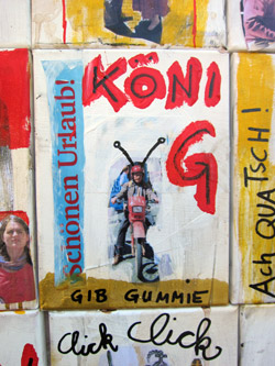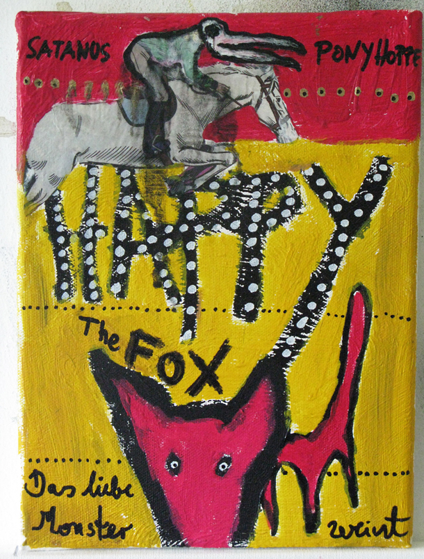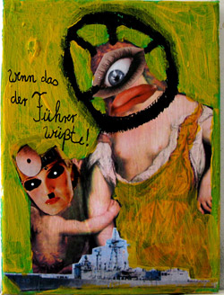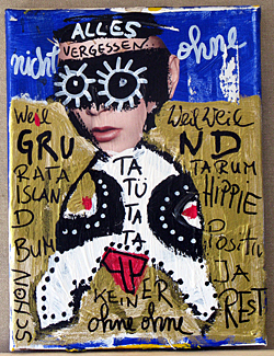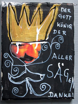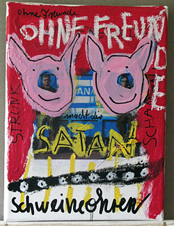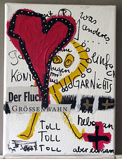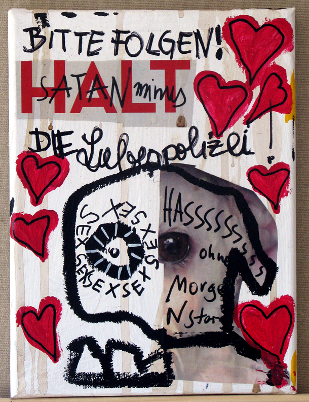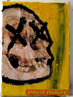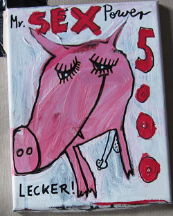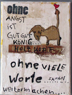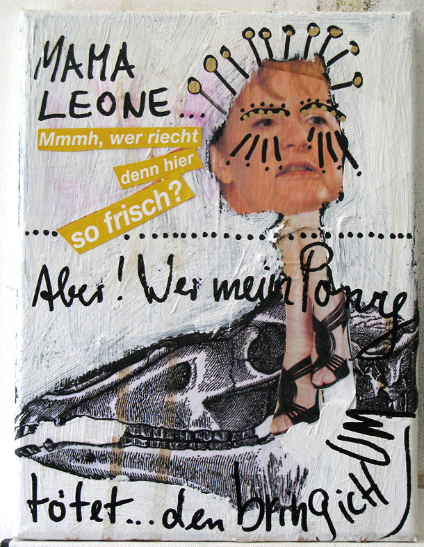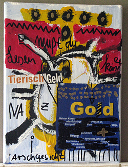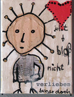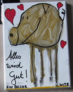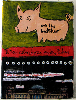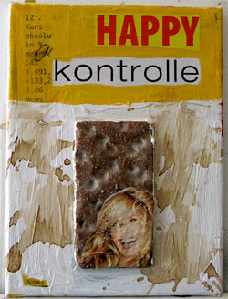 Witzig, zynisch und ziemlich düster verarbeitet er auf kleinen "Leinwändchen" (18 x 24 cm) das aktuelle mediale "Krisenrauschen" – und zeigt, wie man auch auf diese "Krise" blicken kann. Ironisch nämlich, aus einer ganz anderen Perspektive – und kreativ. So landet etwa die ewig strahlende Übermutter und Model-Casterin Heidi Klum auf einer Scheibe Knäckebrot, ist auch das „kleine Pony“ in der Krise – und rät ein anderes Werk mit dem verfremdeten Profil der Kanzlerin: "Man muss es eben nehmen wie ein Bad Hair Day".