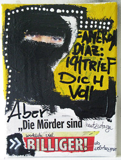 Mit seinem Mix aus Schrift, Fotos, Farbe und Zeichnung provoziert Giltjes erneut mit Bildern wie "Katholisch kurzarbeiten…. glaub an dich selbst…." oder dem "Rettungsprogramm: Sei wie Jesus – jetzt noch billiger". Und Opel wird auch gemahnt: "Blödmann – Du hast den Rettungsschirm vergessen." Es ist diese von Giltjes bekannte Dualität der Empfindungen, die er beim Betrachter mit seinen Arbeiten auslöst und die sein Werk auszeichnet: Da ist der Spaß über den Witz und den Zynismus – und da ist das Erschrecken über so viel Pessimismus gepaart mit distanziertem Spott.